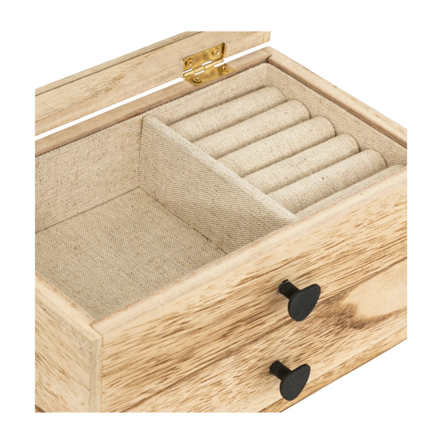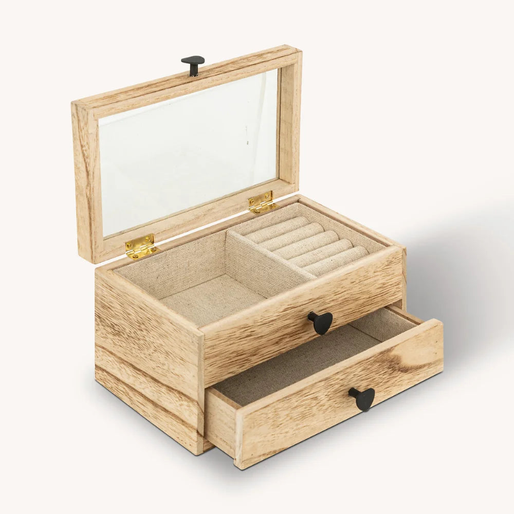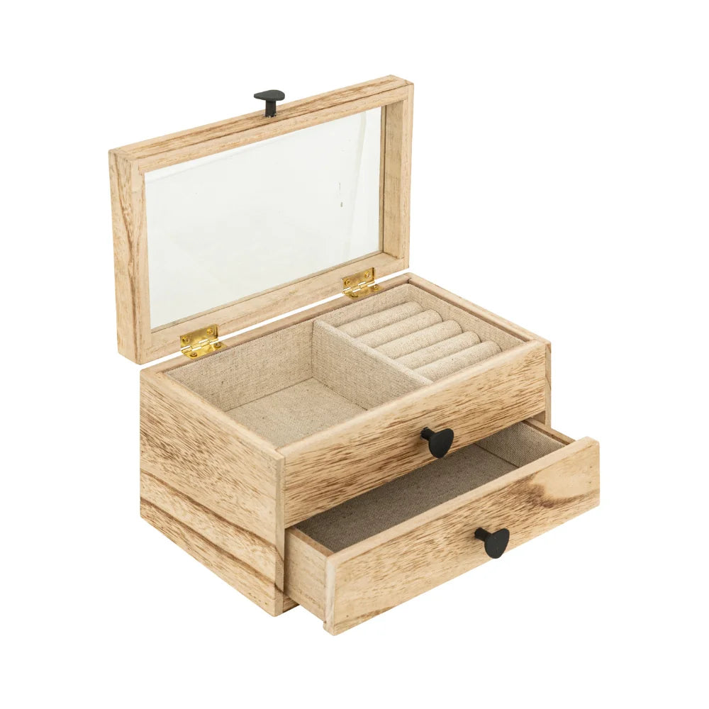 De sieradendoos is gemaakt van paulowniahout en heeft een transparante glazen bovenkant. Onder de deksel bevindt zich een opbergvak met zachte stoffen voering, inclusief een ringenhouder om ringen netjes gescheiden te bewaren. Daarnaast is er een extra lade onderin waarin je grotere sieraden of accessoires kunt opbergen. De zachte bekleding helpt om sieraden te beschermen tegen krassen en beschadigingen, terwijl de verschillende vakken zorgen voor overzichtelijke opslag. Afmetingen zijn: 19,7 cm breed, 11,5 cm diep en 12,6 cm hoog.