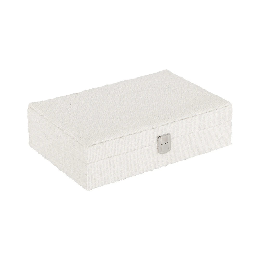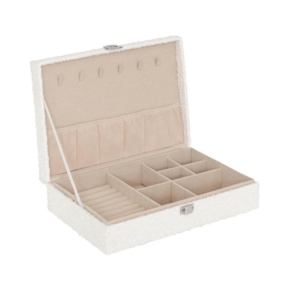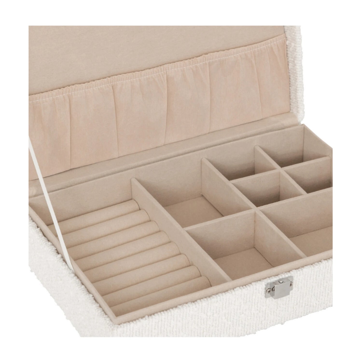 Het doosje is bekleed met een stof en voelt daardoor decoratief en warm aan. Binnenin vind je meerdere sorteervakjes, waaronder een speciaal vak met ringenhouder. In het deksel zijn haakjes en zachte zakjes verwerkt, ideaal voor kettingen en kleine sieraden. De combinatie van MDF en polyester maakt het doosje geschikt voor dagelijks gebruik in huis. Het sieradendoosje is 28 cm breed, 19 cm diep en 7 cm hoog.