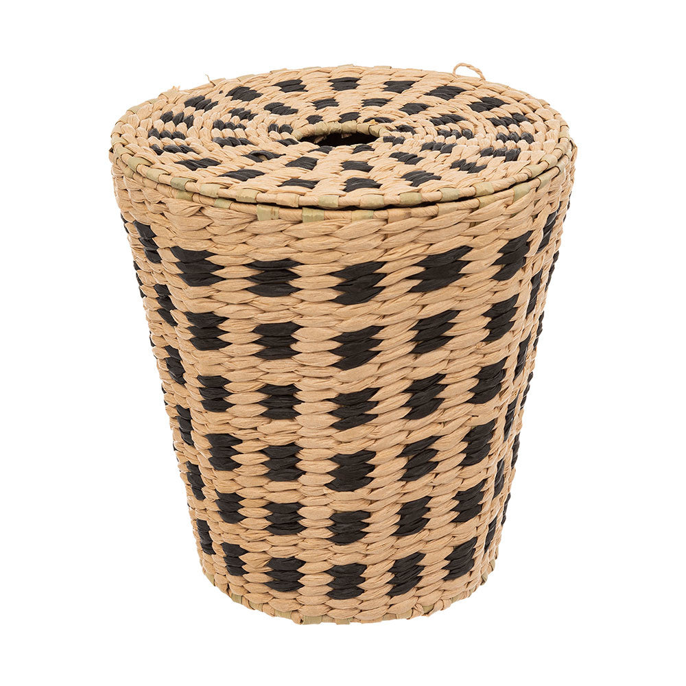 De opbergmand is rond en heeft een deksel waarmee je de spullen volledig uit het zicht kunt opbergen. Door de totale capaciteit van 7 liter kun je ook voorwerpen als kleine knuffels en ander speelgoed eenvoudig opbergen. Het rond mandje met deksel heeft een zwart geblokt ontwerp en heeft een diameter van 24 cm en een hoogte van 25 cm.