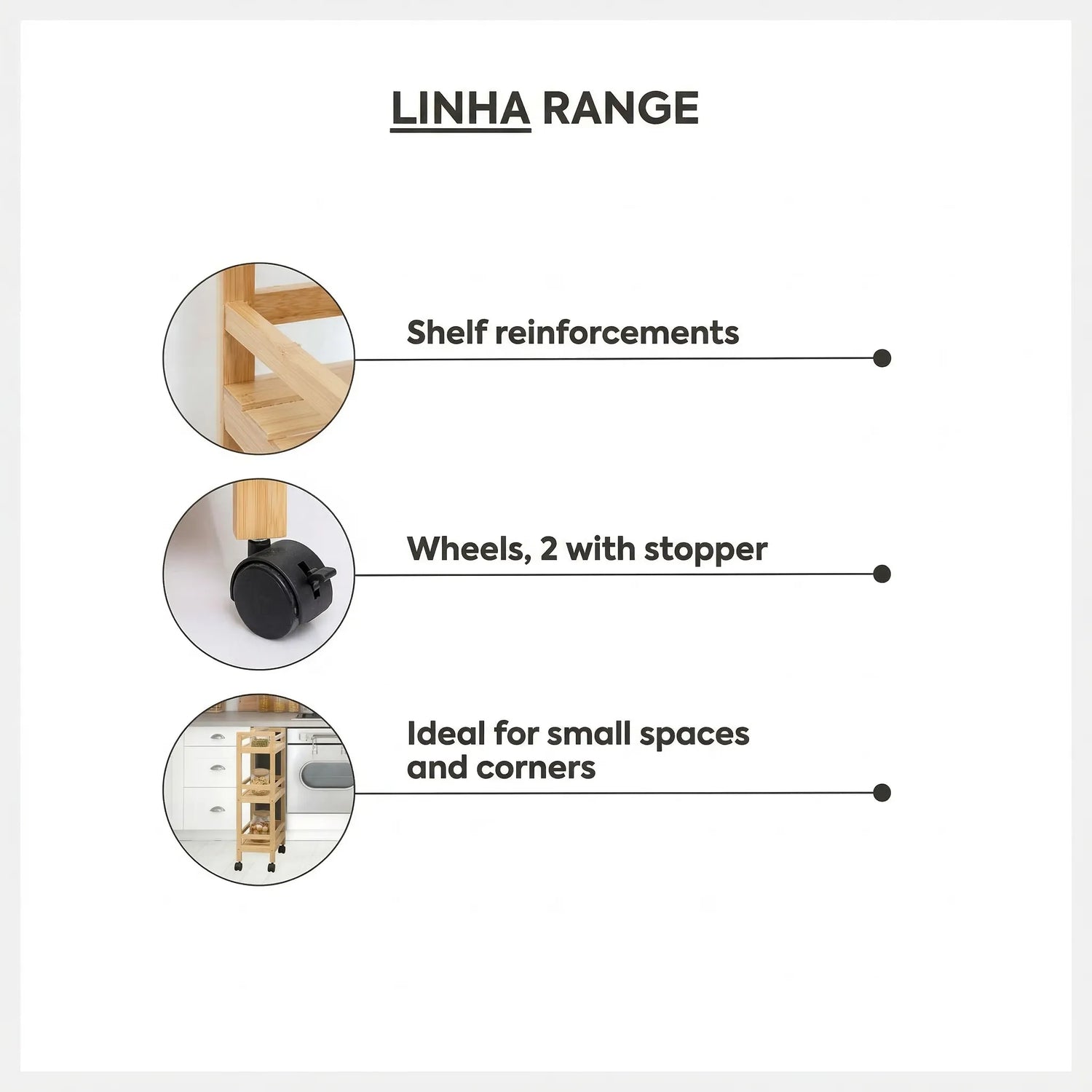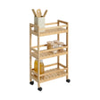 De trolley is gemaakt van bamboe en staat op vier kunststof wielen, waarvan twee met een rem zodat je hem veilig op zijn plaats kunt zetten. De drie open plankjes hebben een opstaande rand waardoor producten niet eenvoudig van het rek glijden. De verstevigde schappen zorgen daarnaast voor extra stabiliteit en maken de trolley geschikt voor dagelijks gebruik in huis. Dankzij het slanke ontwerp en de open structuur blijft alles overzichtelijk en gemakkelijk bereikbaar. De afmetingen zijn 45 cm breed, 22 cm diep en 80 cm hoog. Hoogte tussen de schappen is 27 cm en de trolley heeft een draaggewicht van 20 kg.
