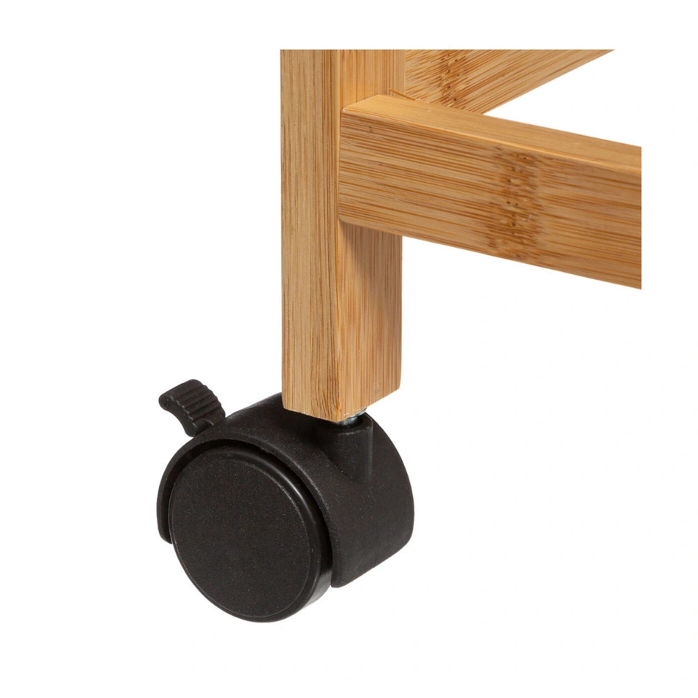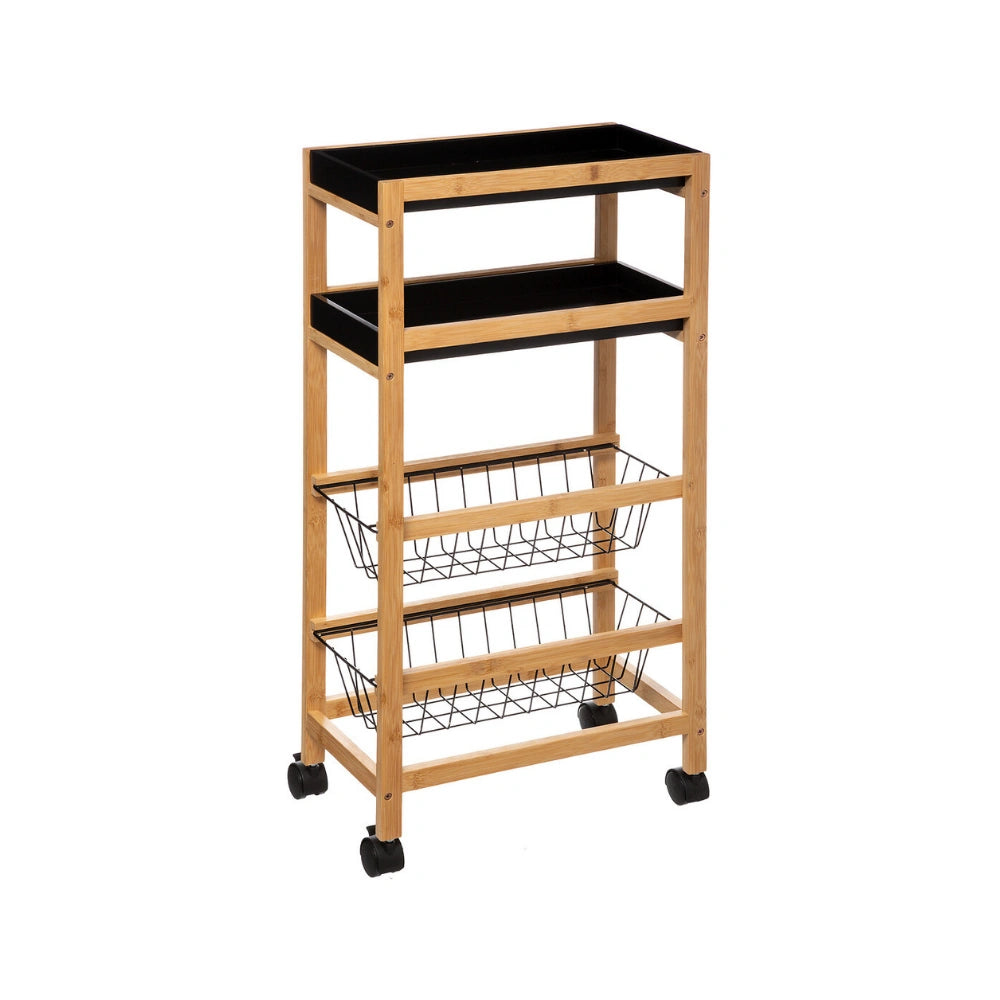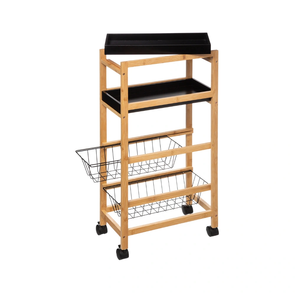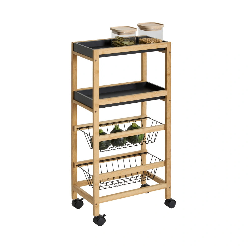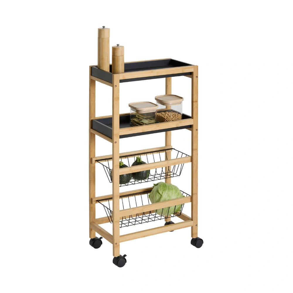 De trolley is gemaakt van een combinatie van bamboe en MDF en staat op vier wielen waardoor je hem eenvoudig kunt verplaatsen. Het ontwerp bestaat uit vier niveaus met twee uitneembare plankjes en twee uitschuifbare metalen mandjes. Hierdoor kun je verschillende soorten producten handig organiseren, zoals voorraadpotten, groenten of keukengerei. De trolley is geschikt voor gebruik binnenshuis en heeft een maximaal draaggewicht van 20 kg. Afmetingen zijn 40,8 cm breed, 21,7 cm diepn en 83 cm hoog.