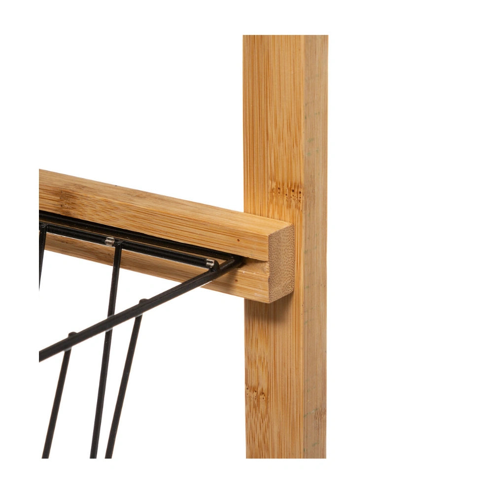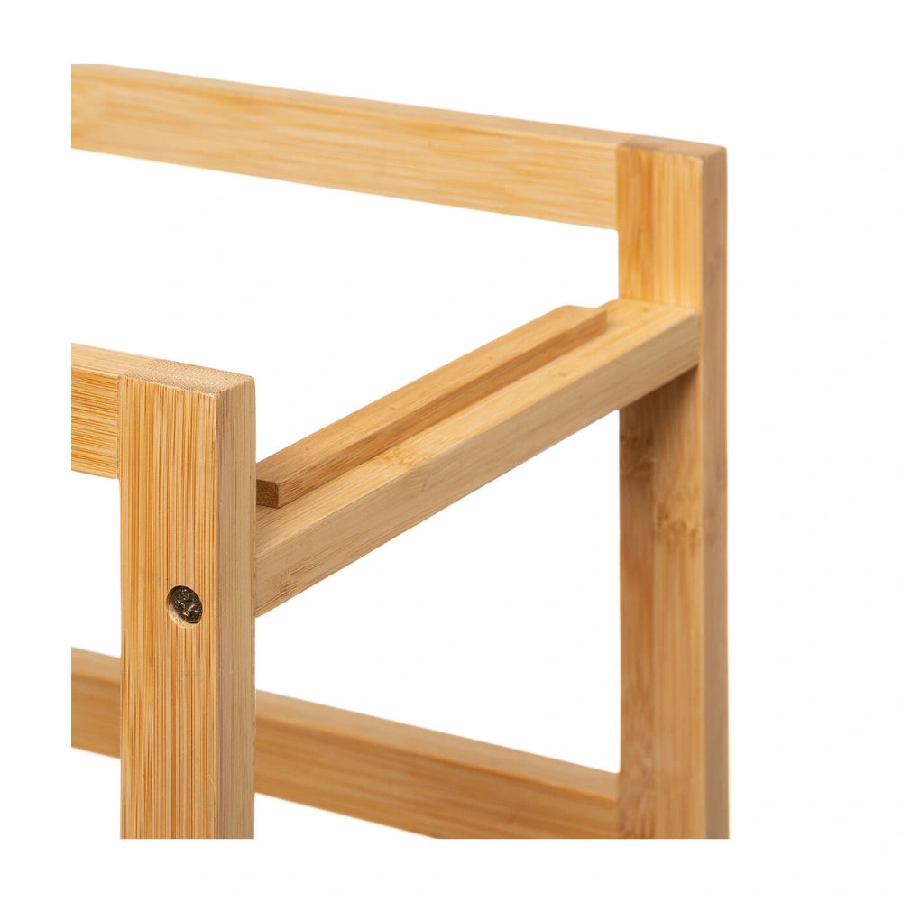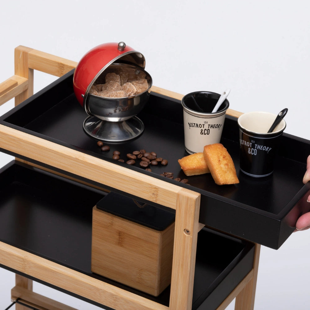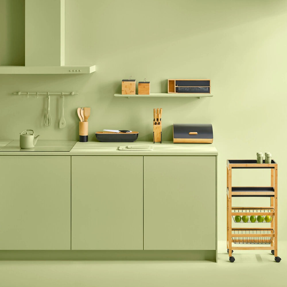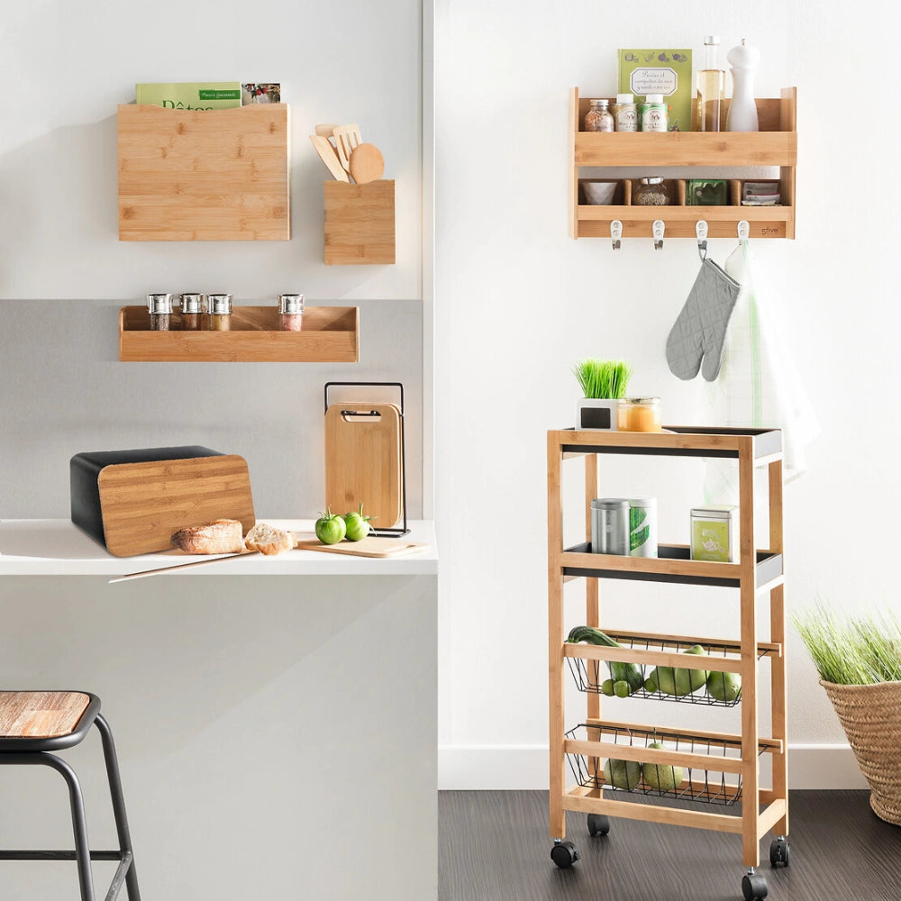 De trolley is gemaakt van een combinatie van bamboe en MDF en staat op vier wielen waardoor je hem eenvoudig kunt verplaatsen. Het ontwerp bestaat uit vier niveaus met twee uitneembare plankjes en twee uitschuifbare metalen mandjes. Hierdoor kun je verschillende soorten producten handig organiseren, zoals voorraadpotten, groenten of keukengerei. De trolley is geschikt voor gebruik binnenshuis en heeft een maximaal draaggewicht van 20 kg. Afmetingen zijn 40,8 cm breed, 21,7 cm diepn en 83 cm hoog.