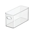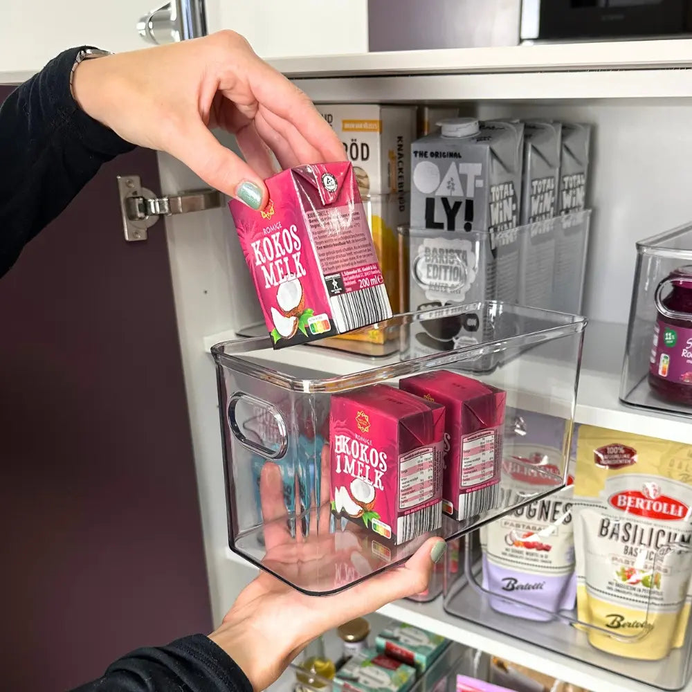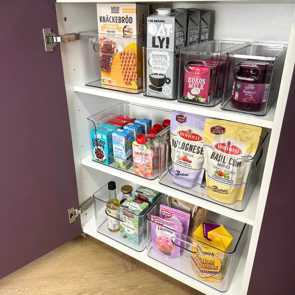 Dit opbergbakje is gemaakt van zeer helder transparant PET kunststof, zodat je in één oogopslag ziet wat erin staat. Dankzij het praktische handvat schuif je het bakje eenvoudig naar je toe om producten die anders achterin je keukenkast verdwijnen, direct bereikbaar te maken. Ideaal als keukenkast bakje voor sauzen, kruiden, bakproducten of voorraad, maar net zo handig in de badkamer voor verzorgingsproducten en cosmetica. De stevige kwaliteit zorgt ervoor dat de bakjes ook geschikt zijn voor zwaardere producten. De afgeronde hoeken geven het transparante bakje een rustige, luxe uitstraling en voorkomen scherpe randjes. Combineer de verschillende formaten voor een efficiënte, nette en blijvend overzichtelijke kastindeling.Beschikbare afmetingen: