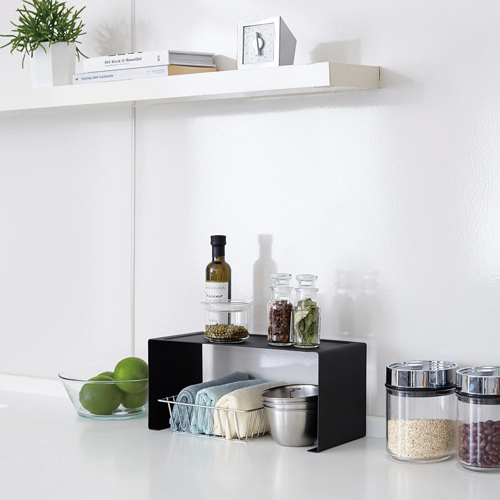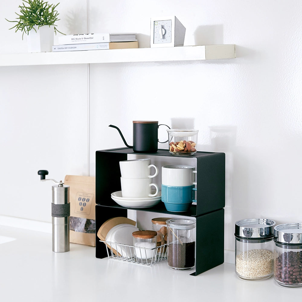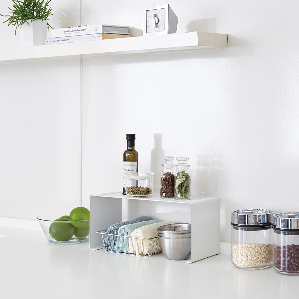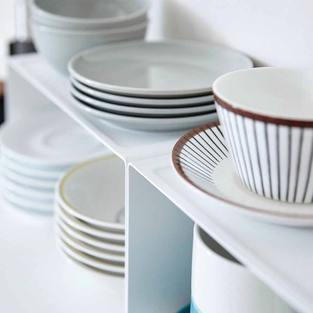 Dit metalen rekje voor in de keuken is ideaal te gebruiken op het aanrecht maar ook in de keukenkast. De maximale stapelhoogte is twee metalen rekjes op elkaar. Zorg voor extra ruimte op het aanrecht of creëer een extra plank. Dit metalen rekje is geschikt voor servies opbergen, borden stapelen of potjes bewaren. Door het moderne design past dit metalen rekje keuken van Yamazaki mooi bij elk interieur.