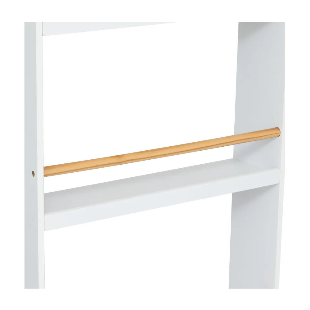 Dit open boekenkastje voor kinderen combineert functionaliteit met een strak ontwerp. Door het ondiepe formaat is de kast bijzonder geschikt voor compacte kamers. De vier etages bieden voldoende plek voor kinderboekjes en decoratieve items, terwijl de ronde stokjes extra zekerheid geven dat alles netjes op zijn plek blijft. De witte uitvoering met houtkleurige accenten zorgt voor een tijdloze uitstraling in de kinderkamer.