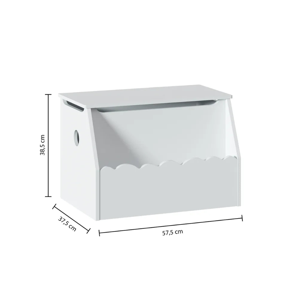 De opbergkist is gemaakt van MDF hout en uitgevoerd in een rustige witte kleur. Aan de voorkant bevindt zich een open opbergruimte met een speels golvend wolkenstructuurtje, ideaal voor het neerzetten van boekjes of kleine items die snel gepakt moeten worden. Het deksel is voorzien van een cilinder die het sluiten dempt, waardoor de klep niet dichtvalt. Dit zorgt voor extra veiligheid in de kinderkamer. Daarnaast beschikt de kist over handvatten aan beide zijkanten, zodat hij eenvoudig verplaatst kan worden. Met een formaat van 57,5 cm breed, 27,5 cm diep en 38,5 cm hoog biedt deze speelgoedkist voldoende ruimte zonder veel plaats in te nemen.